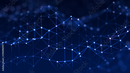 © ihor, Obraz premium Digital dynamic cyber wave. Abstract futuristic blue background with dots and lines. Big data visualization. 3D rendering.