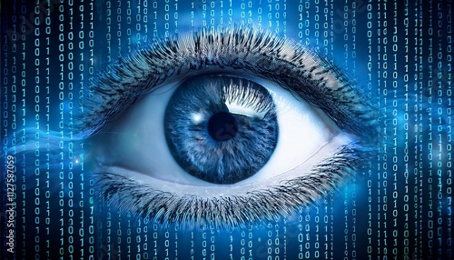 © photostockatinat, Obraz premium Digital Eye: A mesmerizing close-up of a blue eye superimposed on a cascading stream of binary code, symbolizing the intersection of technology and human perception.