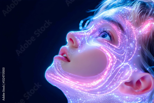 © NANDACHOIRUR, Naklejka premium Digital face overlay with glowing lines