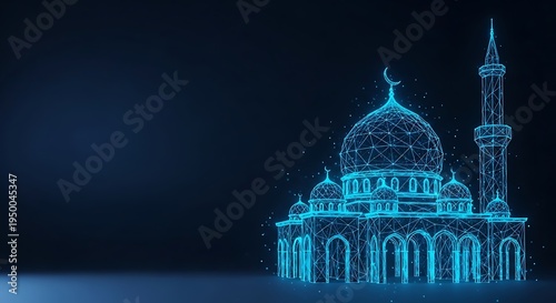 © Rashidul, Obraz premium Digital geometric mosque structure with glowing blue lights on dark background, futuristic Islamic architecture concept