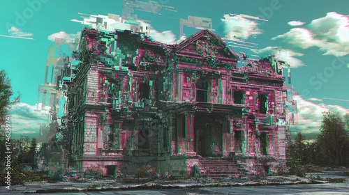 Obraz premium Digital Glitch Art: Surreal Decaying Mansion with Chromatic Aberration,...