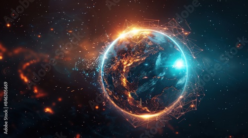 Fototapeta premium Digital global network connectivity with glowing nodes and earth representation