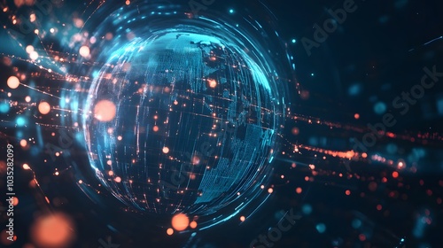 © Dandelions1706, Naklejka premium Digital Globe with Glowing Lines and Particles