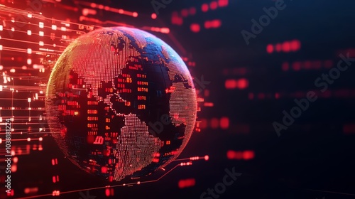 Obraz premium Digital globe with red data streams representing global connectivity.