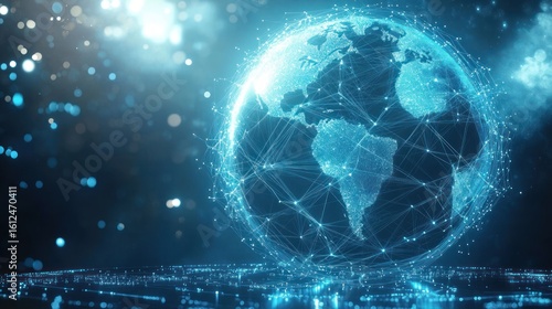 Obraz premium Digital glowing globe with visible continents connected by intricate network lines symbolizing global communication and data exchange in a futuristic technology environment