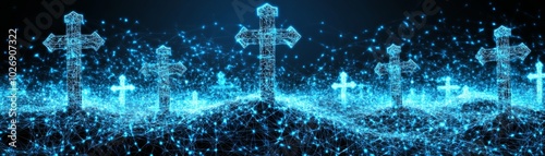 © UraiwanT, Obraz premium Digital Graveyard, a surreal landscape of glowing blue crosses amidst a network of interconnected lights, symbolizing the fusion of life and technology in a spiritual context.