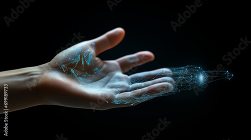 © TrendyImages, Obraz premium Digital hand hologram on dark background with copy space, Ai generated image.