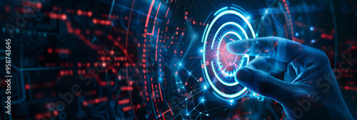 Obraz premium Digital hand interacting with glowing futuristic interface. Advanced technology and human-computer interaction