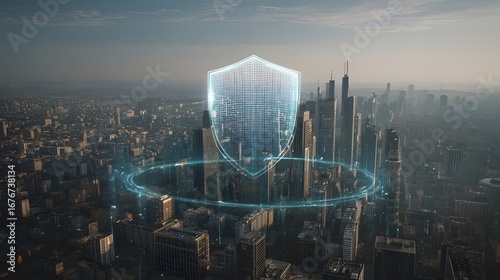 Fototapeta premium Digital Hologram Shield Above Modern City Skyline, Financial Security and Cyber Protection Concept
