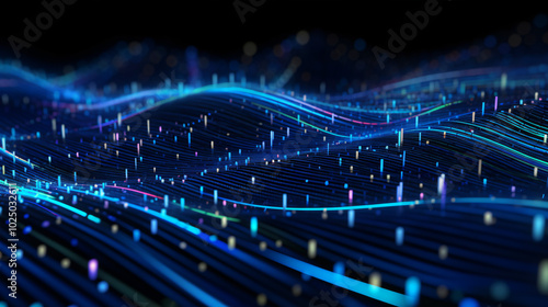 © Monika, Fototapeta premium Digital holographic neon waves, data transfer, information exchange, ai technology using and transmitting information, digital patterns background. Cyberspace