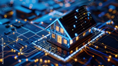 Obraz premium Digital House Model on Circuit Board Background with Neon Lights and...