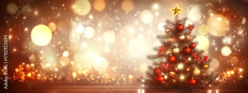 © Panuwat, Naklejka premium Digital illustration Christmas tree dark background decorated red Creative chrsitmas celebrate backgroundof
