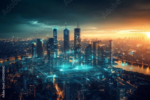 © Panuwat, Fototapeta premium Digital illustration city night lit up blue lights smart