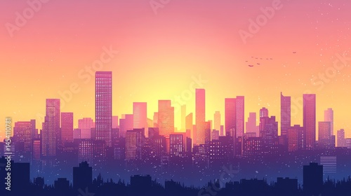 Fototapeta premium Digital illustration of a cityscape at sunset with towering silhouettes and a...