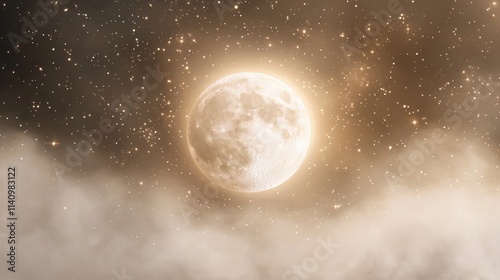Fototapeta premium Digital illustration of a full moon in the night sky. the moon is in the center of the image, with a golden hue and appears to be glowing brightly.