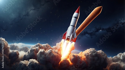© MST, Fototapeta premium Digital illustration of a rocket made of glowing orange geometric lines and points