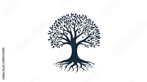 © ziya, Naklejka premium Digital illustration of a stylized, black silhouette tree with extensive roots and numerous leaves.
