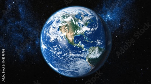 Obraz premium Digital illustration of Earth globe in space, with continents and clouds visible. Shows geographical features and climate patterns.