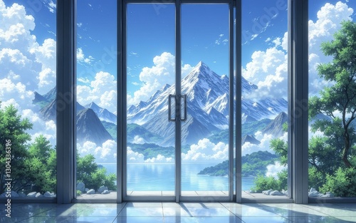 © Anarkali Art, Fototapeta premium Digital Illustration of Glass Door Opening to Mountain Landscape with Snow Capped Peaks