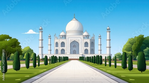 © khonkangrua, Fototapeta premium Digital Illustration of Magnificent Taj Mahal Surrounded by Lush Greenery and Clear Blue Sky