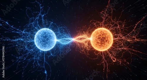 © Hasan, Fototapeta premium Digital illustration of two atomic particles with interconnected energy lines, representing scientific concepts in physics and atomic structure