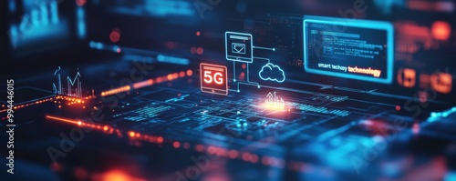 © Georgii, Obraz premium Digital illustration showcasing 5G smart technology in a futuristic environment with glowing network symbols and digital connectivity elements