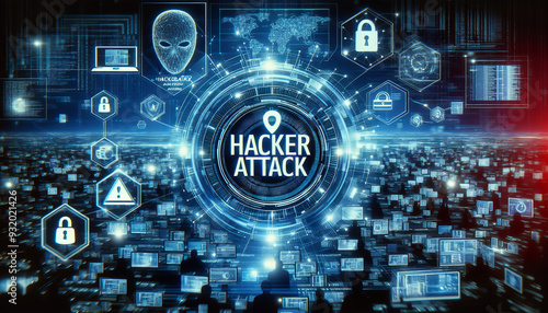 © Yasar, Obraz premium Digital image depicting a cybersecurity alert with the text "HACKER ATTACK" highlighted.