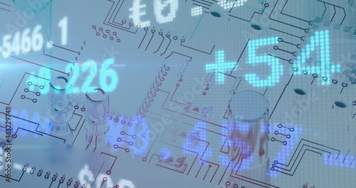 Fototapeta premium Digital image of stock market data processing against microprocessor connections