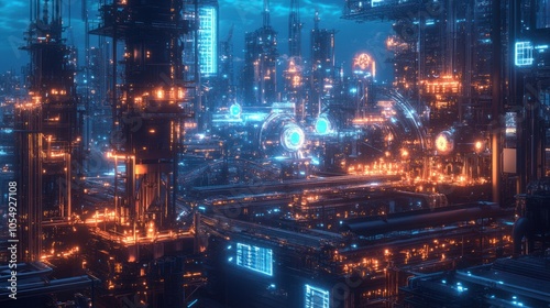 Obraz premium Digital industrial plant with automated workflows, robots, and real-time monitoring systems.