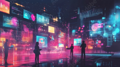 Fototapeta premium Digital innovation hub showcasing advanced data visualization techniques in a futuristic environment