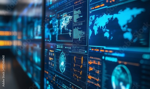 Fototapeta premium Digital interface displaying global data analytics and visualizations.
