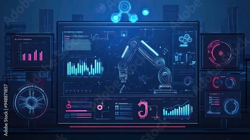 © Pannin, Obraz premium Digital interface displaying robotic process automation of business workflows, with streamlined processes and optimization tools highlighted.