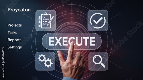 © MediaStockAI, Fototapeta premium Digital interface featuring execute button and project management icons.