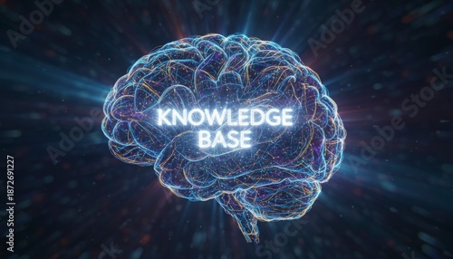 Obraz premium Digital Knowledge Base Text Over Glowing Wireframe Human Brain Model