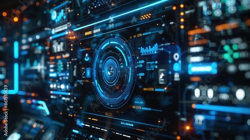 Fototapeta premium Digital lock, blue system monitoring interface, data analysis chart, front view, highlights data protection, technology tone, complementary color scheme
