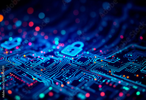 © Mario, Fototapeta premium Digital lock glowing in purple and blue set against a blue background with cyan and magenta dots, secure and futuristic.