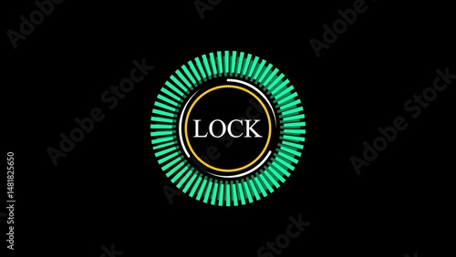 Naklejka premium Digital lock icon graphic with radial elements and the word lock security concept on black background