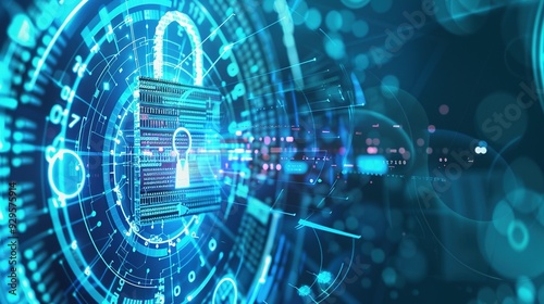 © Ahmad-Muslimin, Fototapeta premium Digital lock icon on a blue background with abstract shapes