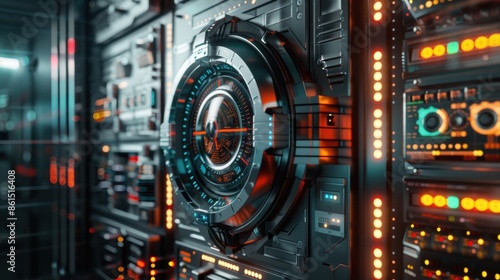 © kitidach, Obraz premium Digital lock, silver data analysis chart, system monitoring interface, side view, conveys system security, robotic tone, splitcomplementary color scheme