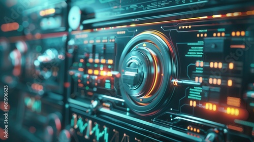 © kitidach, Obraz premium Digital lock, silver system monitoring interface, data analysis chart, side view, conveys data integrity, robotic tone, splitcomplementary color scheme
