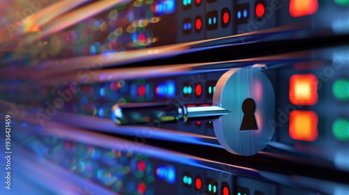 Obraz premium Digital Lock Symbol on Server Rack with Colorful Lights Representing Data...