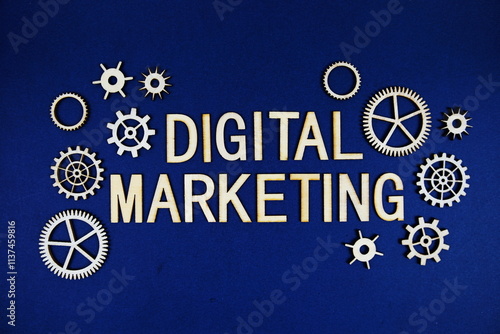 © may1985, Naklejka premium Digital Marketing alphabet letters with gears element on navy blue background