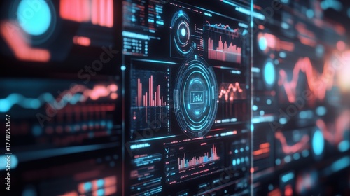 Obraz premium Digital Marketing Metrics Futuristic digital dashboard with glowing graphs and data visualizations in blue and red hues.