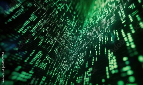 © Vergiliy, Naklejka premium Digital Matrix Code Visualization with Green Binary Data Flowing in 3D Space