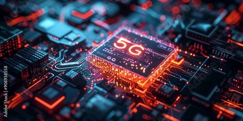 Obraz premium Digital microchip design, glowing 5G technology circuit board
