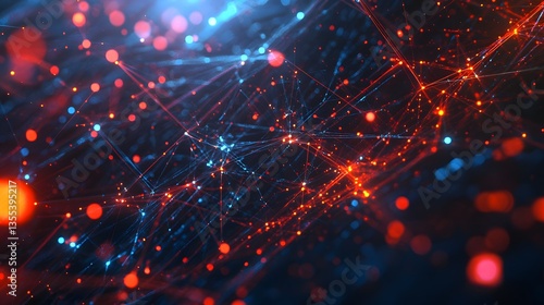 © Kaniz Fatema, Obraz premium Digital Network: An abstract representation of a complex digital network, with glowing red and blue nodes connected by intricate lines, symbolizing connectivity and data flow.