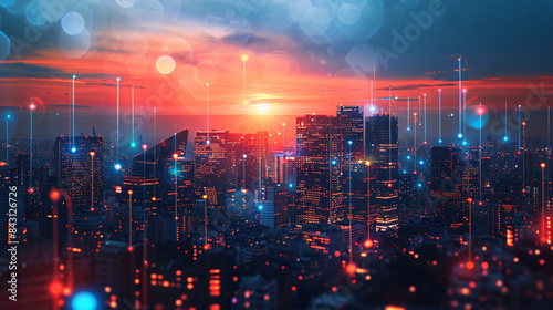 Fototapeta premium Digital network concept overlaying a vibrant city skyline at dusk for smart city connectivity
