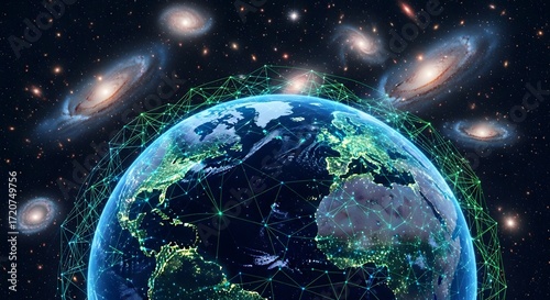 © Pixcellence, Obraz premium Digital network concept with earth in space surrounded by galaxies and connections