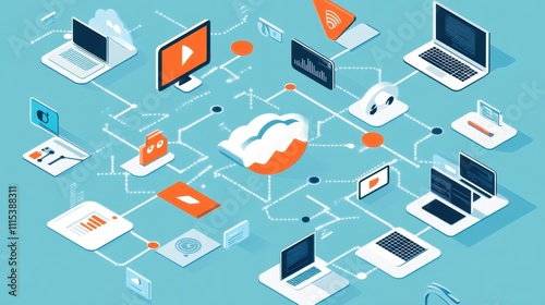 Obraz premium Digital network illustration showcasing interconnected devices and data flow.