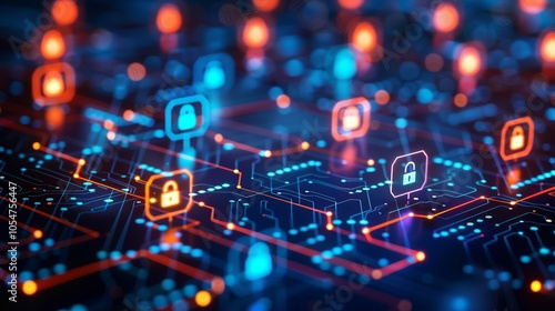 Fototapeta premium Digital Network Security Concept with Locks and Circuit Board for Mitigating Risks in Cybersecurity